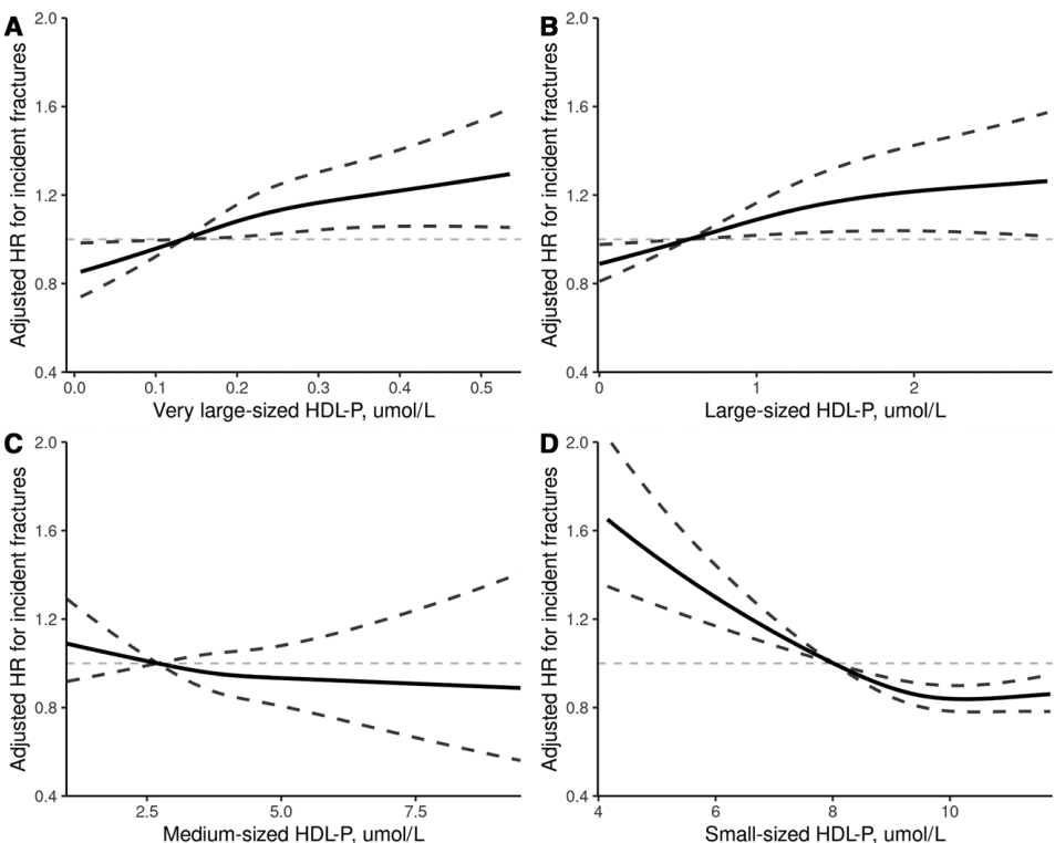 HDL并非均一的物质,而是由不同大小的颗粒组成。研究人员进一步对HDL颗粒大小进行分析,发现HDL颗粒平均大小与骨折风险正相关,平均大小每增加一个标准差,骨折风险增加12%。