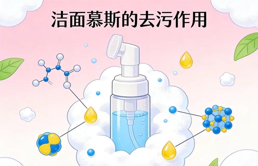 总结来说,洁面慕斯的去污核心是表面活性剂的“两亲结构”,通过吸附、乳化、剥离三个阶段,将皮肤表面的各类污垢温和分解并带走。