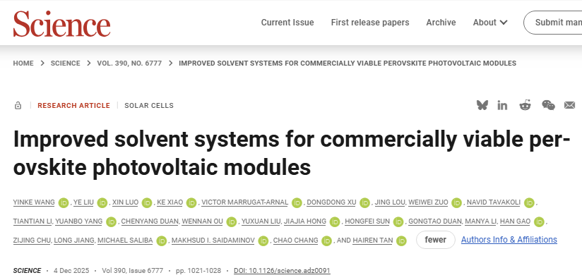 2025年12月,《科学》杂志重磅刊登这项颠覆性成果:南京大学牵头,联合中、加、德三国团队,成功造出7200cm²(1.2米×0.6米)的钙钛矿光伏巨膜,稳定发电效率达17.2%,还一次性通过了光伏界最严苛的IEC 61215全项认证!这意味着,被寄予厚望却卡壳十年的钙钛矿技术,终于从实验室走进现实,中国直接领跑第三代光伏革命!