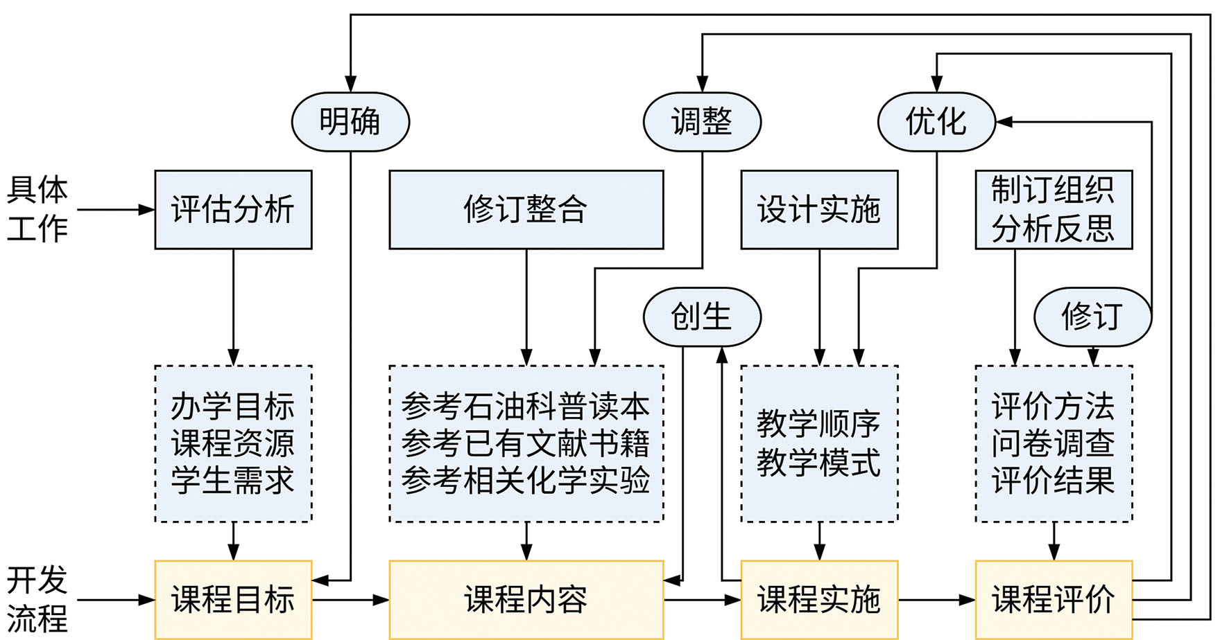 20世纪40年代,美国课程论专家拉尔夫·泰勒提出了“目标模式”,成为现代课程开发理论的基石。尽管其存在一定的局限性,但是对于“源油”校本课程开发依然具有极佳的借鉴性和可操作性。目标模式课程的开发按照“确定课程目标”“选择和组织课程内容”“课程实施”“课程评价”4个基本问题组织课程开发,其流程如图1所示。