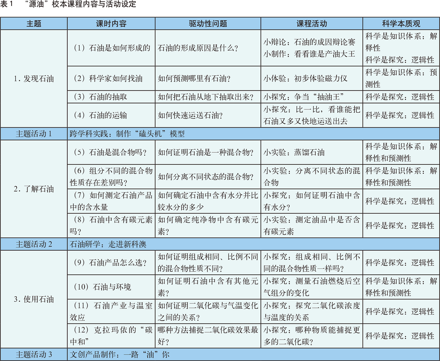 教材体系的内容构建分成3种,分别是以知识的逻辑结构为主线构建教材体系、以学生发展能力为周期构建教材体系、以问题为单元构建教材体系[4]。由于本课程属于校本选修课程,时长为1学期,不适合选用知识逻辑结构为主线的长周期教材体系;授课学生群体为7年级学生,科学知识与探究能力的积累都还较少,也不适合选用以问题解决为主线的教材体系。该课程旨在发展学生的科学本质观和实验探究能力,比较适合以学生学习能力发展周期为主题的教材体系[5],我们设定的“源油”校本课程内容与活动如表1所示。