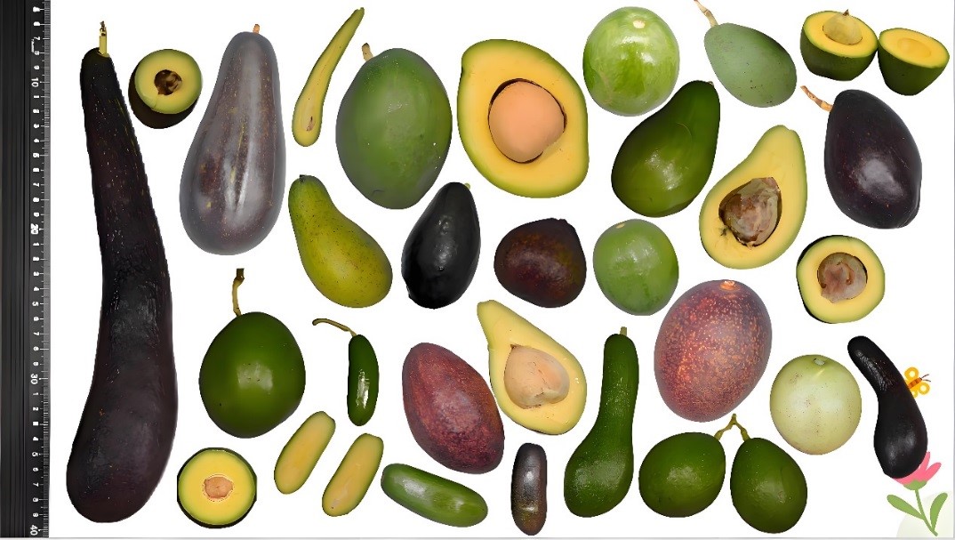 不同品种的牛油果,在果实形状、颜色、大小上差异很大。牛油果形状有梨形、球形、茄子形、椭圆形等,成熟后外皮颜色多样,有黄绿色、绿色、红色、褐色、紫色等,果实大小很悬殊,大如同手掌般,小的就跟双指差不多,表皮有的粗糙带颗粒感,有的则平滑光亮。切开后可以看到果肉大多呈淡黄色、黄绿色,也有红色,果核大小也不一样。