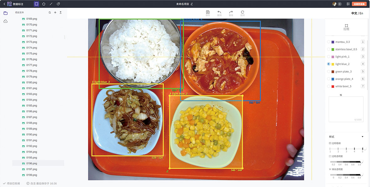在人工智能教育平台选择“在线工具”,然后选择“人工智能工坊”中的“数据标注”,点击“创建数据标注”。然后上传images图片文件夹,在“数据标注”界面的右上角选择“分类管理”,分别添加7种类别,选择对应的类别,框选出餐盘的边界,从而完成标注,成功创建数据集(见图1)。