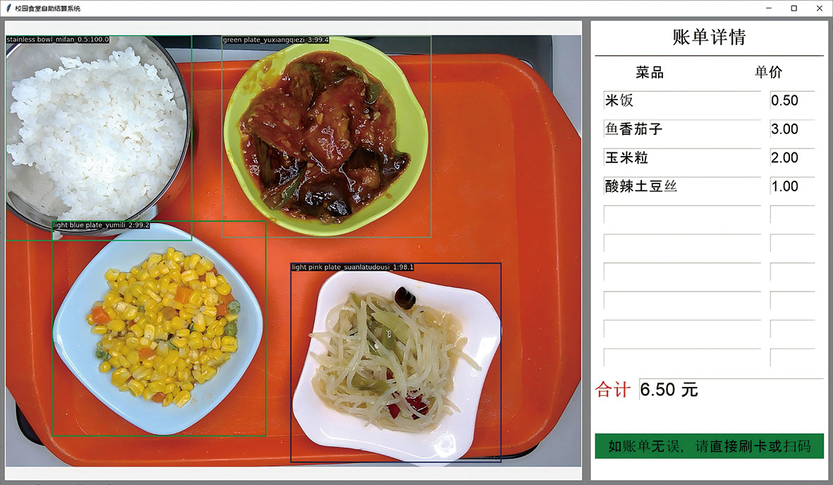 学生通过真实的项目实践,学会了数据收集、标注和转换,学会了使用MMEdu完成模型训练,包括调整优化学习率、轮次等超参数,以及利用预训练模型迁移学习技术提高训练效率和准确性。同时,还学会了模型推理、转换和图形用户界面部署。自助结算系统的核心功能分为基础版和进阶版。基础版通过识别餐盘颜色完成结算,食堂共有7种颜色的餐盘代表7种不同的价格,师生可以自助选餐,将选好菜的托盘放入结算区,通过结算区内置摄像头对餐盘完成目标检测,并根据不同颜色的餐盘对应的价格,计算出结算刷卡的金额。进阶版不仅能识别餐盘颜色,还能识别出每道菜的菜名,在显示屏上显示出完成检测的餐盘图片、菜名及对应价格,最后完成自助刷卡结算(见图4)。