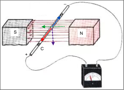 当金属棒在磁铁南北两极间水平运动时,电流检测器的指针保持静止未摆动,表明无电流产生。当金属棒的运动方向(紫色虚线箭头)与磁铁南北两极间的电子运动整体取向(绿色虚线箭头)垂直时,电流检测器的指针摆动幅度最大,表明形成了电流。若金属棒不动,仅让磁铁垂直于金属棒运动,同样可检测到电流。
