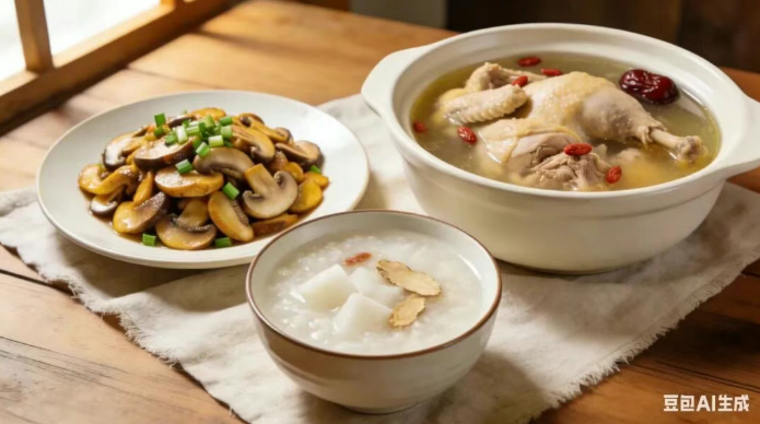 2.保证营养摄入,适当食用蘑菇、鸡汤等增强体质的食物。如乏力、易出汗也可喝黄芪山药粥(黄芪15g煮水半小时,用黄芪水与大米、山药一起熬粥)。