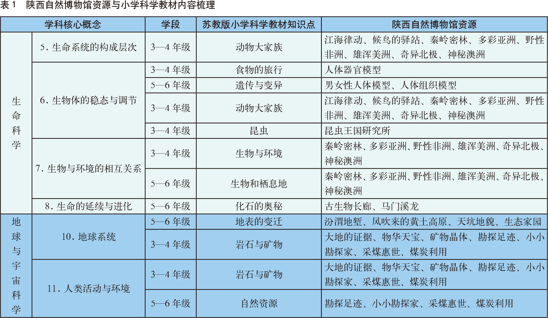 陕西自然博物馆关于矿物的展厅包括“地质万象”展厅和“煤海之光”展厅,配有专门的科普教室向大众科普岩石的基本状况、用途及各类仪器知识。依据新课标的核心概念及西安地区采用的苏教版小学《科学》教材内容,本研究对陕西自然博物馆各场馆具体的展品资源进行了深入分析,整理出了适宜于开展馆校合作的活动内容和配套博物馆展品资源(表1)。本研究以4年级第5单元第3节“矿物与我们的生活”为主题,依托展厅资源,引导学生系统学习岩石知识,树立合理利用矿产资源的意识。