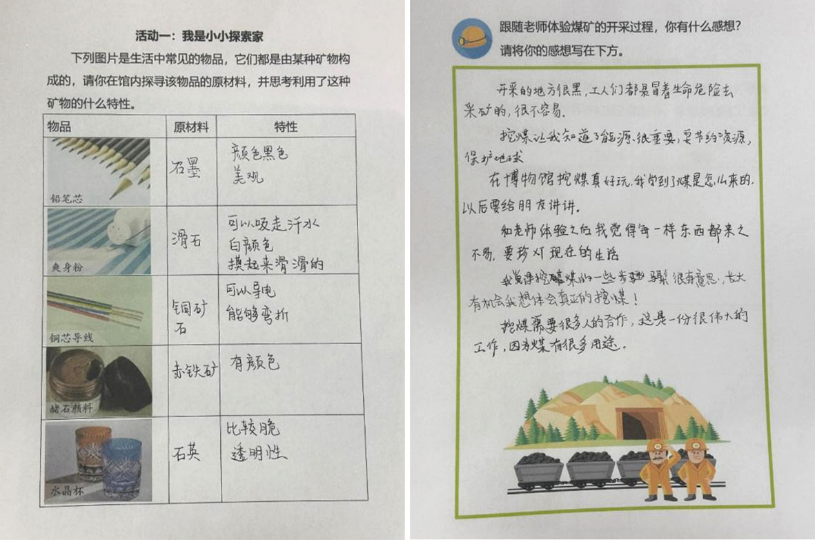 研究将教学活动分为馆前、馆中、馆后3个环节。馆前,介绍学习主题及博物馆情况,讲解安全准则。馆中,按照“小小探索家(生活物品中矿物成分)—探索石膏的制作及实际应用—体验从矿石到制品的生产过程”逻辑线索设计各个环节的教学活动、学生活动及配套学习资源。各环节均采用问题导向及任务驱动的教学策略,通过任务单形式引导学生深度参与教学各环节的活动。教学活动涵盖小组资料搜集与整理、场馆参观体验、动手实践、成果展示交流等多种形式,既发挥了教师在教学实施过程中的主导作用,又凸显了学生在学习过程中的主体地位。比如,“小小探索家”活动以“常见包含矿物的物品原材料是什么”为驱动问题,让学生以小组形式开展调查,并完成学习单。馆后,阅读课本知识,完成课后作业,填写试卷与问卷。