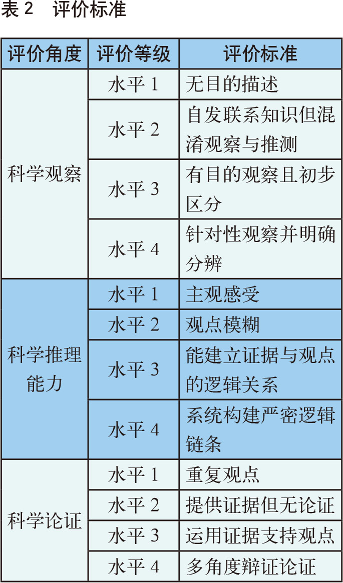 研究依据教学录像中的行为表现,从科学观察、科学推理和科学论证3个角度对学生科学实践能力进行评价。依据课程标准中的学业质量标准,设置4个等级评价标准(表2)。