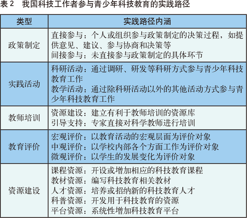 科技工作者,又称科学技术工作者,是指在自然科学领域掌握相关专业的系统知识,从事科学技术的研究、传播、推广、应用,以及专门从事科技工作管理等方面的人员,职业上主要包括科学技术研究人员、工程技术人员、农业技术人员、卫生技术人员和自然科学教学人员[1]。科技工作者参与青少年科技教育,有助于挖掘基础教育阶段的科技创新人才培养潜力,拓展科技创新人才培养路径。