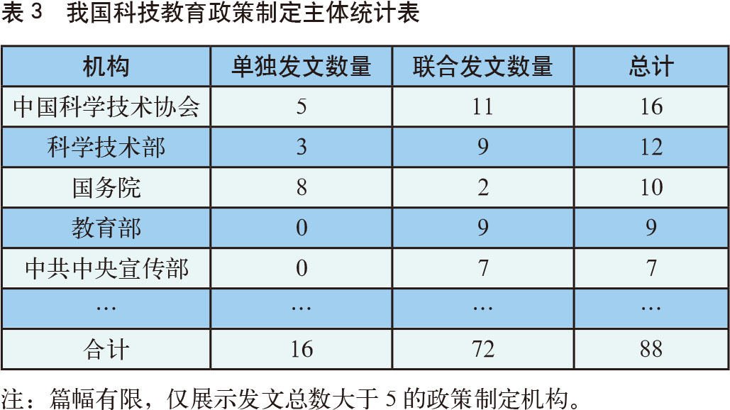 对出台政策的机构进行分析,不仅能够确定该政策领域的核心机构或重要信息来源,而且一定程度上可以反映政策领域横向部门的联系程度和政策涉及的范围[11]。据统计,31份科技教育政策文本的制定部门主要有中国科协、科技部、国务院、教育部、中宣部等26个国家机关部委(表3)。由表3可知,中国科协出台政策的次数最多,在联合行文方面占据绝对优势。国务院及其各职能部门是政策颁布的重要力量,单独行文发文共11次。此外,部门联合发文数量占比约48%,表明随着政府职能的转变,各部门合作治理的理念增强,青少年科技教育管理跨部门协同合作日益密切,逐渐形成齐抓共管、多措并举的工作局面。