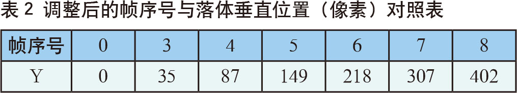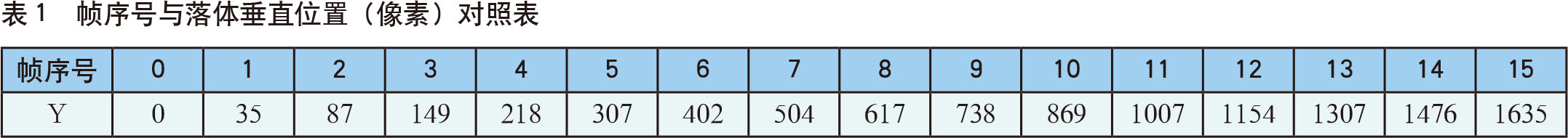 经过动态阈值处理后,可获得落体在每一帧对应的垂直位置,帧序号与垂直位置对应关系见表1,采用该处理方式最后得到的重力加速度g值为7.854 m/s2,误差较大。