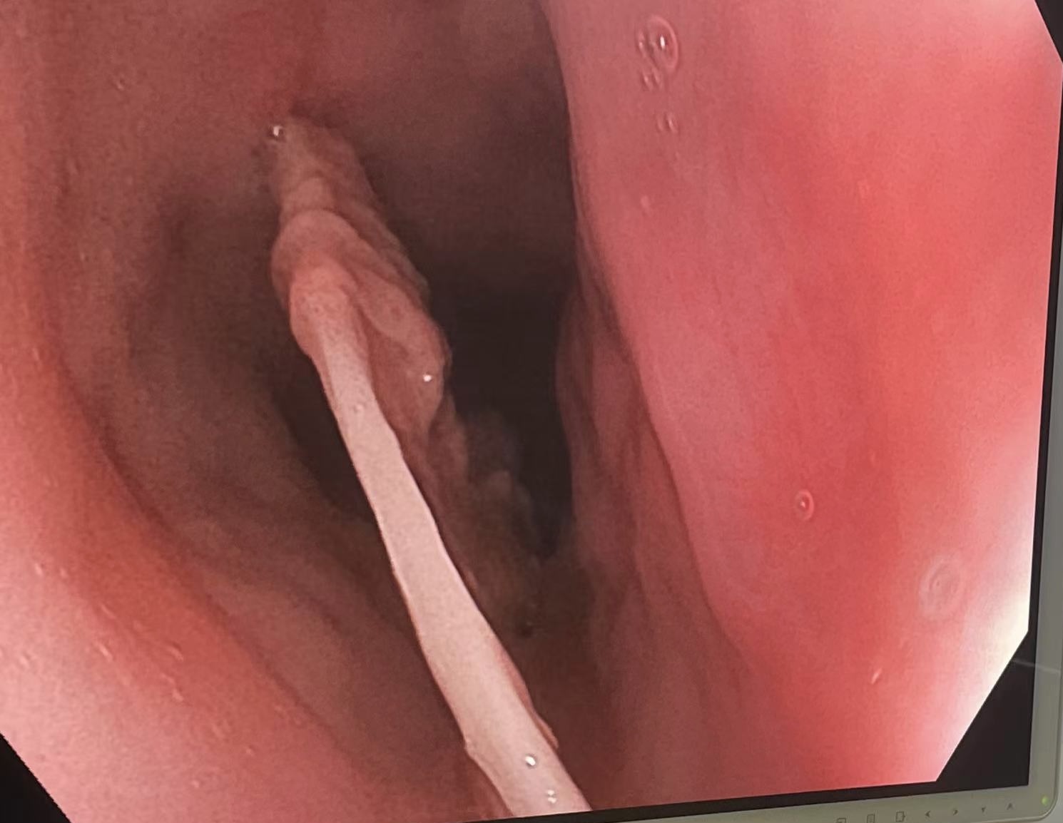 一切准备就绪后,李静泊主治医师循腔进镜,在距门齿约23-25厘米处,楔形鸭骨赫然在目,其两端已扎入食管前后壁。团队凝神聚力,在舒眉及戴新明等助手的默契配合下,先小心地将嵌入前壁的骨刺轻柔拔出,再同样谨慎地处理后端骨刺。为保护脆弱的食管黏膜不被锋利骨尖二次划伤,团队巧妙调整异物方向,最终顺利将异物完整取出。全程操作不到10分钟,零出血,无继发黏膜损伤。