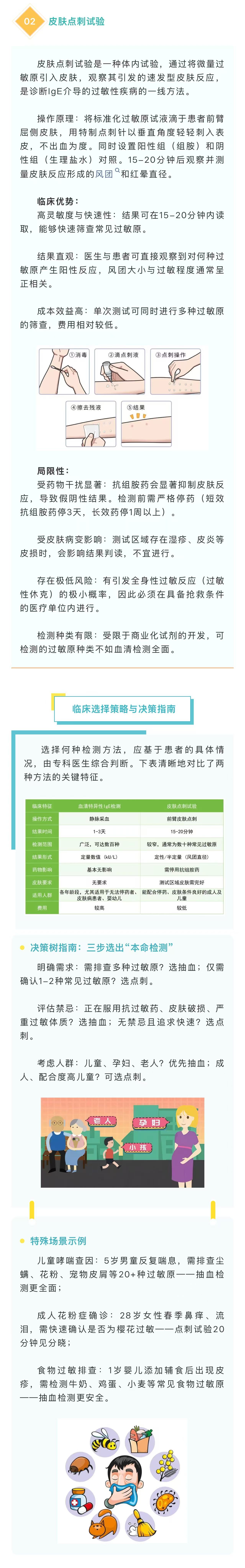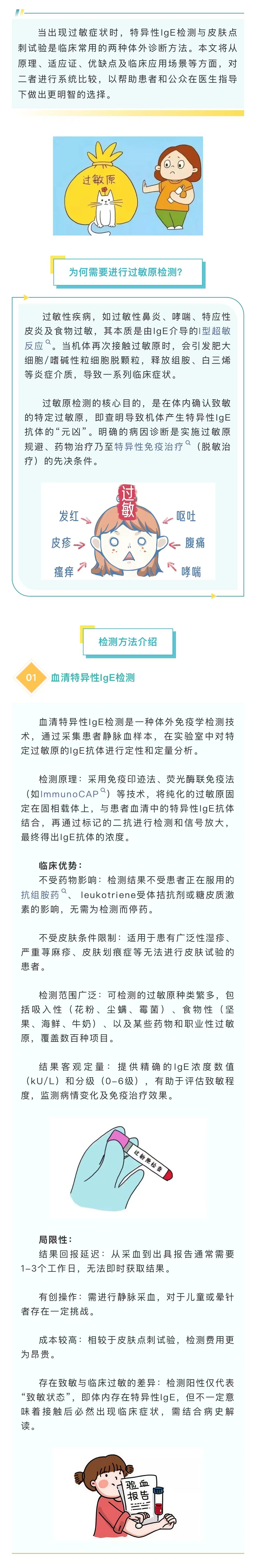 图文简介: 当出现过敏症状时,特异性IgE检测与皮肤点刺试验是临床常用的两种体外诊断方法。本文将从原理、适应证、优缺点及临床应用场景等方面,对二者进行系统比较,以帮助患者和公众在医生指导下做出更明智的选择。