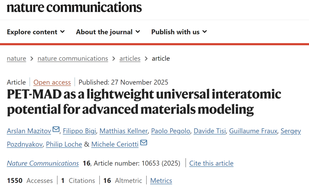 相关研究成果以「PET-MAD as a lightweight universal interatomic potential for advanced materials modeling」为题,已发表于 Nature Communications。