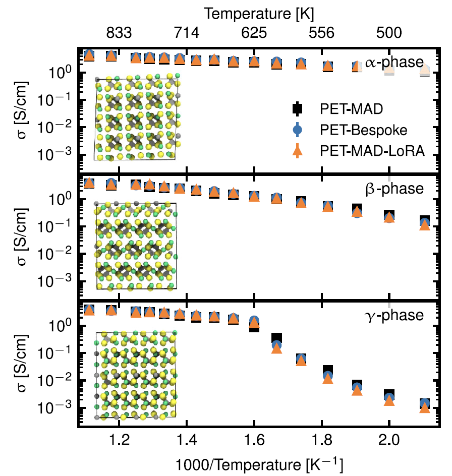 在宽温度范围内,PET-MAD、其 LoRA 微调模型与 PET-Bespoke 专用模型计算得到的各相电导率