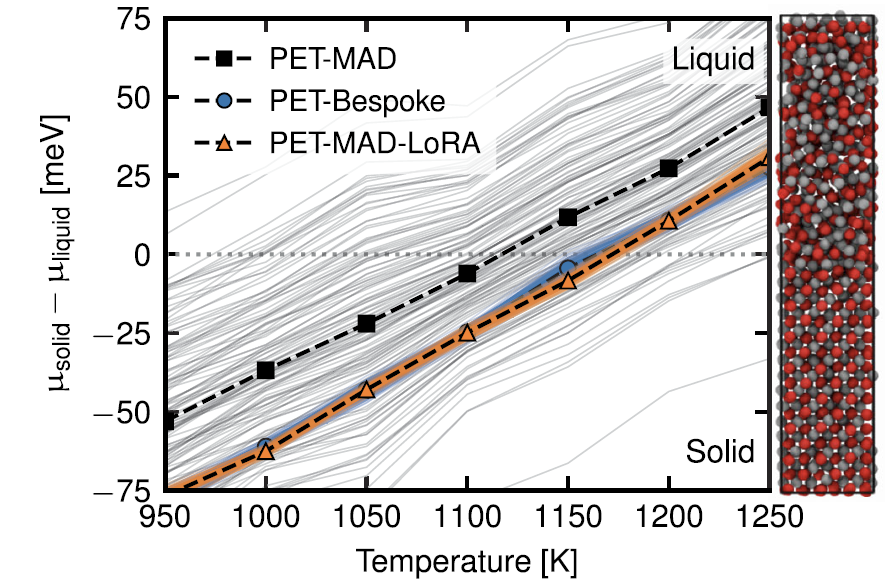在计算其熔点时,采用界面钉扎法的结果如下图显示,经 LoRA 微调的 PET-MAD 与 PET-Bespoke 专用模型的预测结果完全吻合(1169±3 K vs 1169±4 K)。