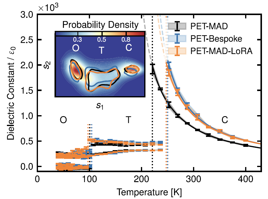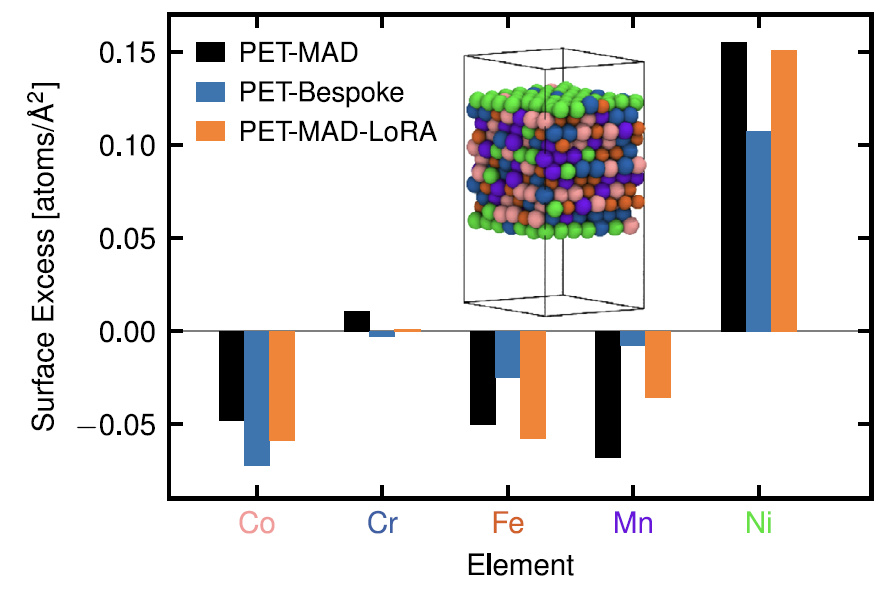 实验表明,在数据量有限的场景下,经 LoRA 微调的模型表现始终优于为该体系从头训练的专用模型。即便在钛酸钡等复杂体系中,微调模型也能在保持通用精度的同时,产出与专用模型相当的物理可观测量,因此被推荐为面向特定应用的优化方案。
