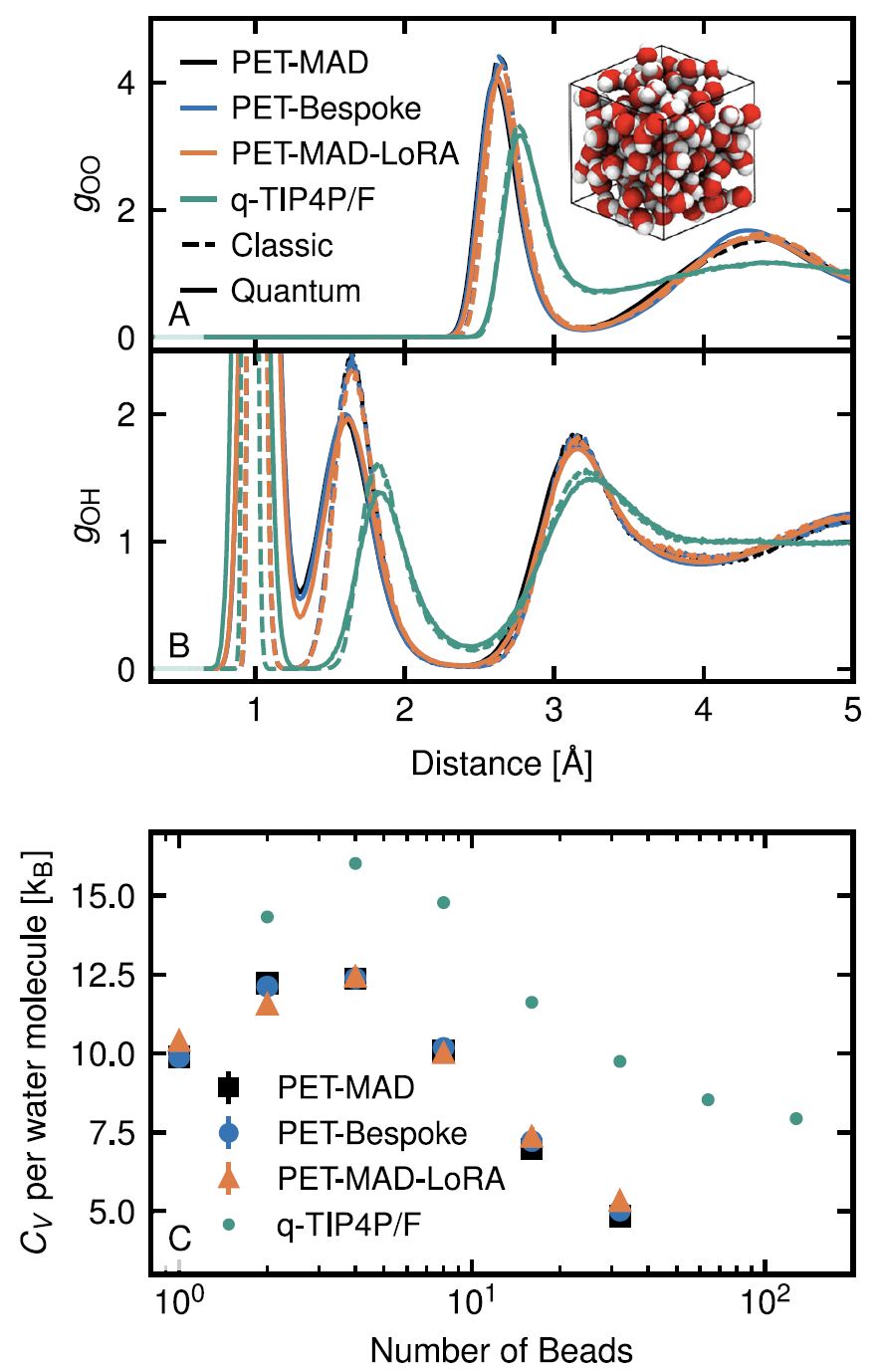 通过路径积分分子动力学模拟,PET-MAD 成功刻画了氢原子量子涨落导致的结构有序化与质子离域现象。虽然受限于其所学的 GGA 泛函精度,模拟体系在室温下表现出「过冷液体」特征,但在径向分布函数与热容计算上,其结果与 PET-Bespoke 专用模型高度一致,且其高效性使得这类计算量巨大的量子模拟更为可行。