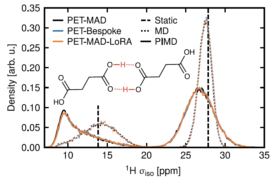 PET-MAD 驱动的动力学模拟结合化学屏蔽模型,成功揭示了原子核量子运动对 ¹H 核磁共振屏蔽常数分布的影响。如下图所示,氢键质子的屏蔽分布在量子采样下显著展宽并下移,这与基于高精度 DFT 训练的 PET-Bespoke 专用模型结论一致,证明了 PET-MAD 在预测复杂功能特性方面的潜力。