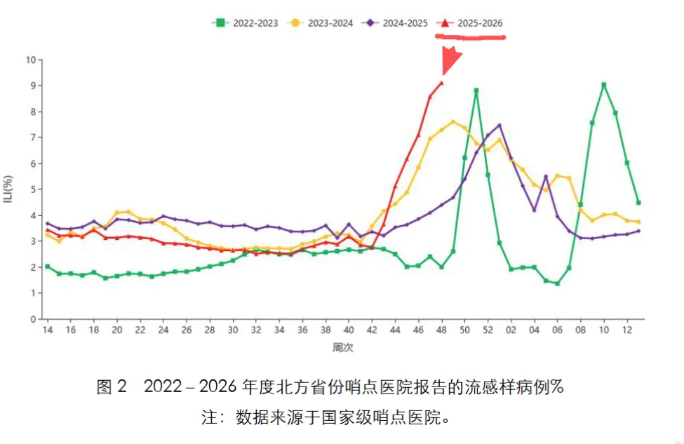 从中国疾病预防控制中心的流感监测数据看到,从南到北,从东到西,全国都一样,谁都逃不过,今年的流感季数据,已经打败其他年份同期,成为近4年之首。