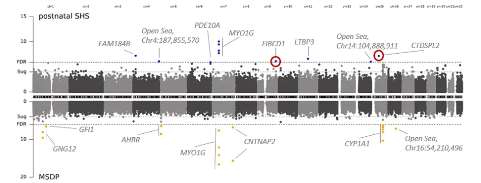 孩子生活在有人吸烟的家庭里,会在基因调控层面留下11个明确的“烟雾痕迹”。这些点在图中的上半部分以蓝点的形式突出显示,其中两个是科学界从未见过的新标记。下半部分的橙点是大家熟悉的孕期吸烟带来的变化,用来说明分析是可靠的。这张基因地图得以让我们直观地看到烟雾在孩子体内留下的痕迹在哪里。|参考文献[1]