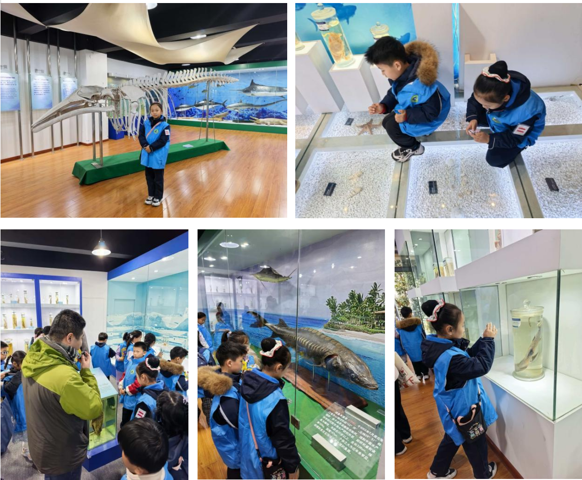 继续往前走,空气里弥漫着一股淡淡的,类似图书馆旧书页的味道。一排排高大的靠着墙的标本陈列柜整齐肃立,蓝色的氛围灯从顶部洒下,伴随着柔和的展示灯光照亮了浸泡在透明溶液里的一个个生命。看到了非常多的标本,有从幼年到成年的大黄鱼、海马、带鱼、企鹅等标本并列,体型差异触目惊心。我看到中华鲟那古老而奇特的身形,老师说中华鲟是溯河洄游性鱼类,因水坝建设,其自然繁殖通道可能会被阻断。还有好多好多知识,一下子真的没办法完全记下来,还能记得老师说有些鱼已经灭绝,有些鱼已经很少了,现在的“成年”鱼,往往只相当于几十年前的“少年”尺寸。