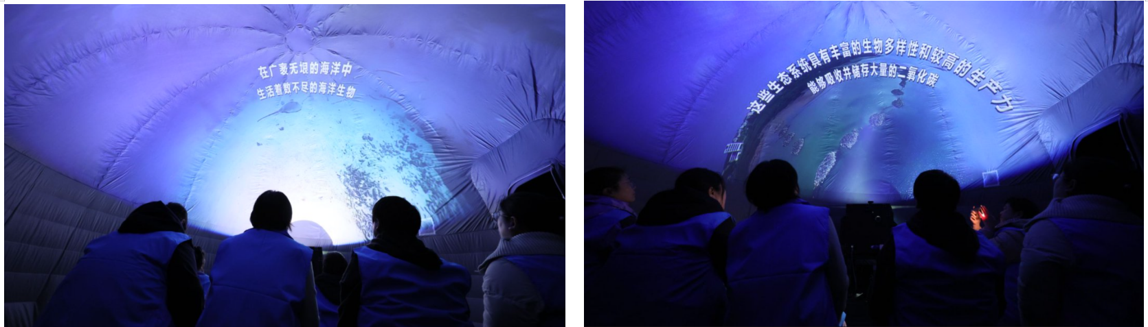 走出标本馆,那份沉静微凉的气息,瞬间被一股充满现代感的灼热所取代。那是在踏入球幕影厅的一刻发生的转变。灯光熄灭,我仿佛忽然漂浮起来,字幕与影像自头顶流淌展开——不,更像是整个世界悄然化作了海洋。四周、头顶、脚下,无处不是流动的蔚蓝。同学们不约而同地仰躺在地,沉浸于科技营造的身临其境之中。我也不由地伸出手,尽管什么也触不到,但那种被海洋温柔包裹的感觉,真实得让人忍不住屏住呼吸。