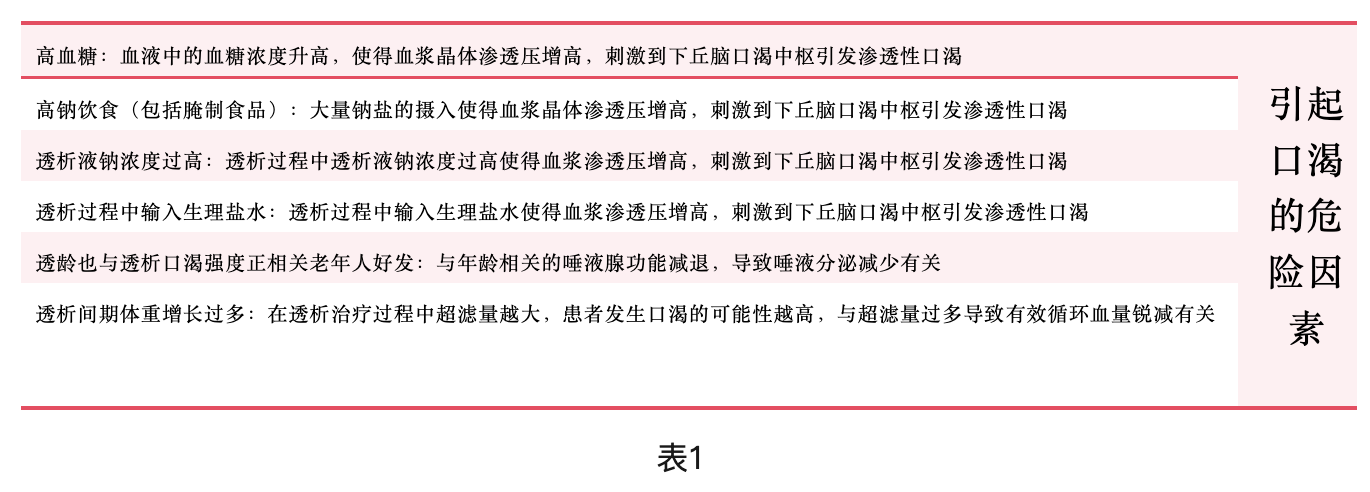维持性血液透析患者口渴数据的庞大,让我们知晓了如此多的患者存在着普遍而又巨大的挑战,对于透析患者会引起口渴的危险因素有哪些?请看表1