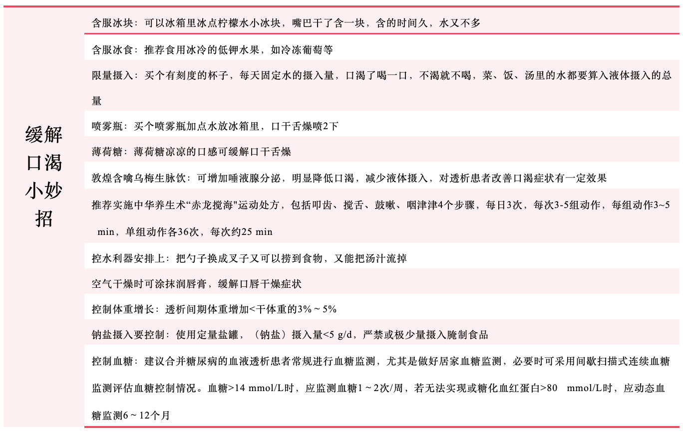 饮食记录表由患者或家属记录,为了预防患者液体摄入超标,每月开展护、患、家属座谈会,对于无尿或少尿的维持性血液透析患者,干体重上升频繁超过5%时,进行评测分析并给出指导方案,做到“家院共预”提高患者的生活质量。希望我们的这篇科普可以在您或您的家人口渴时提供帮助。