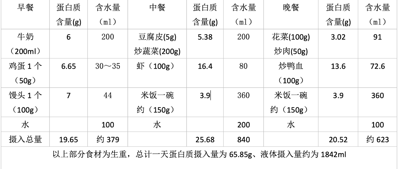 良好的液体、饮食管理对透析患者的治疗效果和生活质量至关重要,同时也极大地挑战了透析患者的自我管理能力,也需要医护人员、患者及家属之间的协同合作。医务人员可为患者制定一日三餐饮食记录表,以体重60公斤的患者为例,24小时液体摄入量=体重60(kg)x3%~5%=1800ml~3000ml如表3