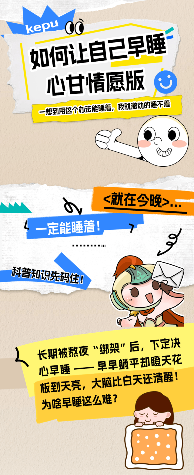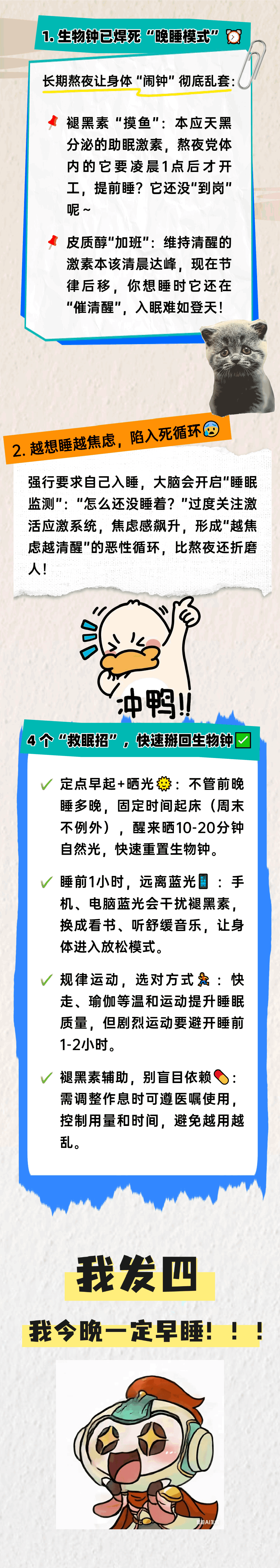 图文简介: “熬夜一时爽,早睡火葬场”,大概是当代年轻人的睡眠写照~ 明明被熬夜熬得头昏脑胀,下定决心要早睡,却总能陷入“躺平两小时,清醒一整夜”的尴尬。