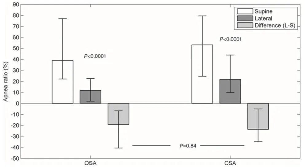 参考资料[4]:以阻塞性睡眠呼吸暂停(OSA)和以中枢性睡眠呼吸暂停(CSA)为主的患者在仰卧位(空心柱)和侧卧位(深色柱)时的呼吸暂停比率(AR)。浅色柱代表侧卧位与仰卧位之间的差异。