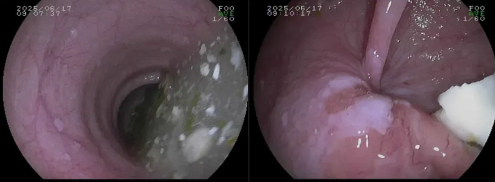 胃镜:食管扭曲扩张、食物残渣和黏液潴留,贲门紧闭,胃镜通过阻力明显。