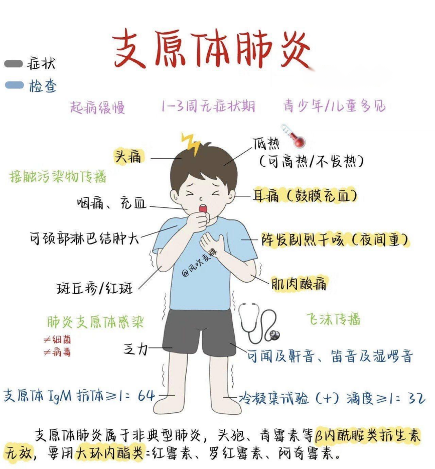 它的攻击目标主要是气管、支气管和肺部等下呼吸道。需注意!它的症状初期很像感冒,容易让家长混淆:一开始可能只是轻微咳嗽、喉咙不舒服,没有发烧或者只有低烧,让人误以为只是普通感冒,没放在心上。但随着病情发展,咳嗽会越来越严重,变成剧烈的干咳,尤其到了晚上更厉害,孩子甚至会咳得睡不着觉。后期可能会出现高烧,肺部也会受到损伤,这时就需要针对性治疗了。