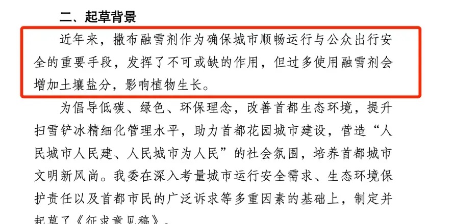 《北京市扫雪铲冰作业工作方案(试点)》起草背景就与融雪剂撒布有关,图片截取自参考资料3