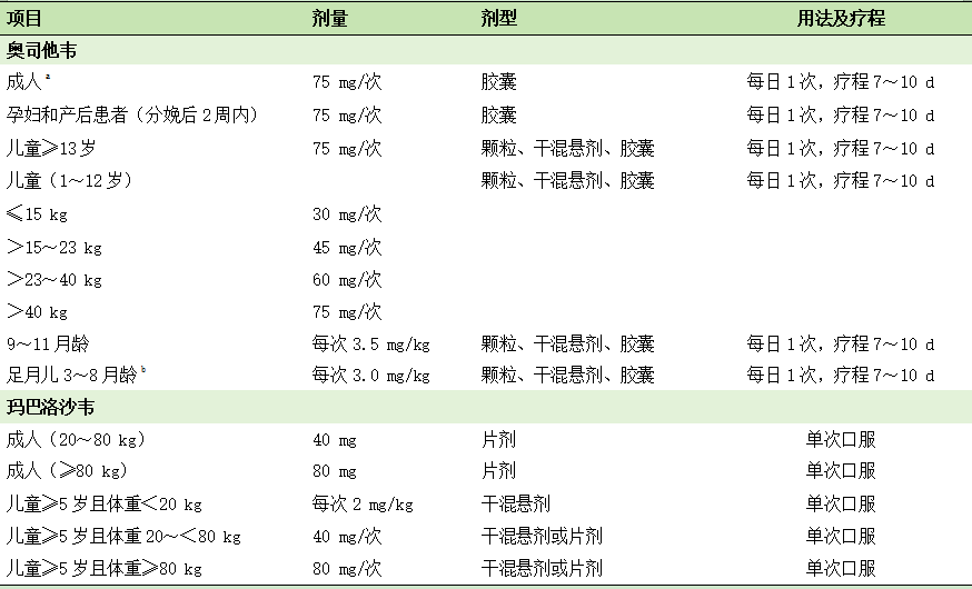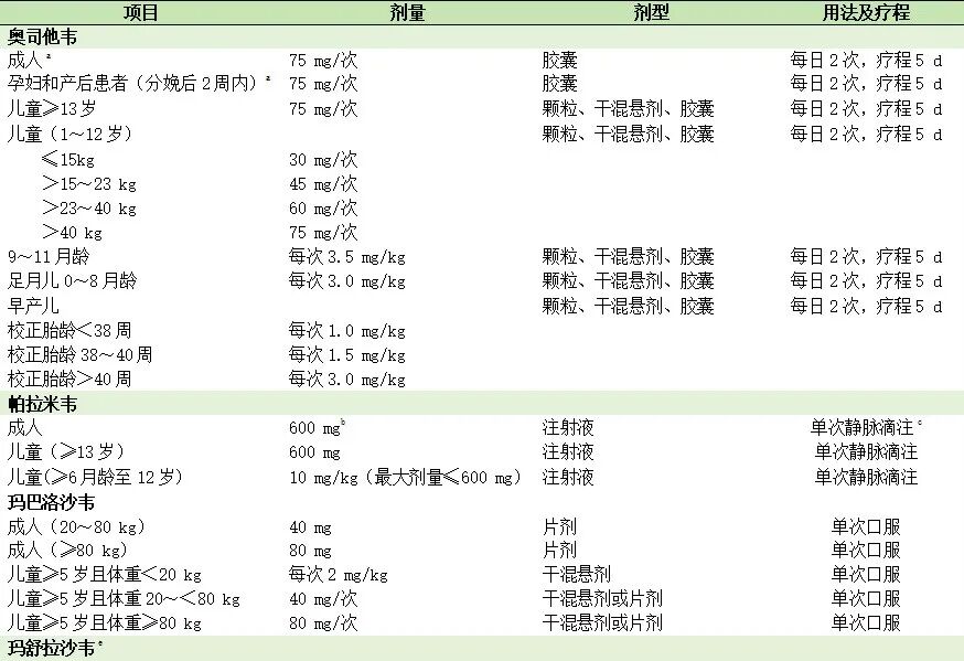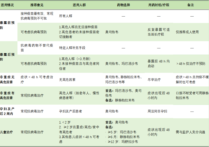 注:a 对于暴露前药物预防,仅推荐用于成人患者,推荐药物为奥司他韦;b 3月龄以下不推荐