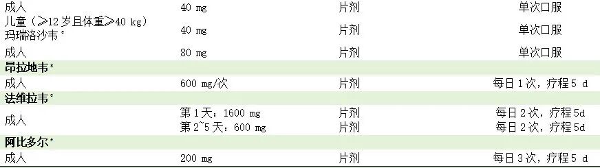 注:a 对于因严重下呼吸道疾病而需要住院的危重症患者,可延长抗病毒治疗时间,尤其是抗病毒治疗5 d后病毒核酸仍呈阳性者;b 对于非重症患者,推荐减量至300 mg;c 重症患者可延长疗程至5 d;d 仅用于非重症患者;e 仅用于无高危因素的非重症患者;f 当前暂缺乏体重<40 kg患儿的证据;g 仅用于无高危因素的非重症甲型流感患者