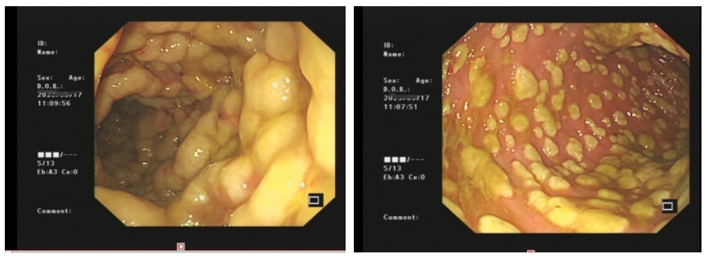 该患者既往有“宫颈癌手术及放疗;尿毒症”病史,曾于当地诊所多次使用抗菌药物。肠镜检查结果显示:镜下可见结肠黏膜充血水肿、糜烂,表面覆有多发、大小不一的丘状黄白色伪膜,疑似伪膜性肠炎。