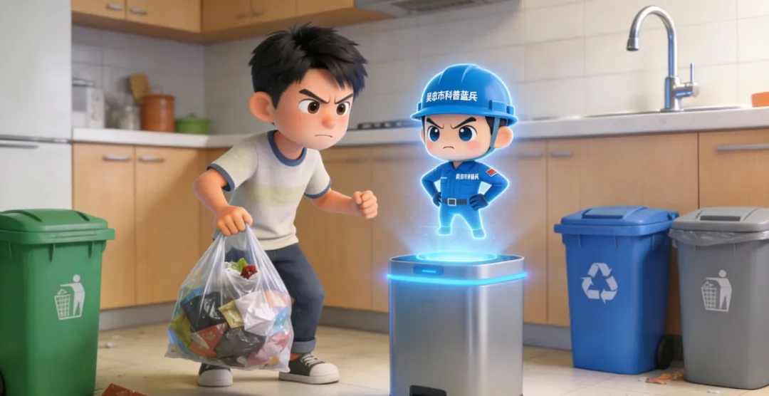 小蓝: “警报!警报!检测到‘垃圾混合投放’高危行为!我是电子科普蓝兵小蓝,你的私人垃圾分类指导员。小明同志,你的操作存在严重逻辑错误!”