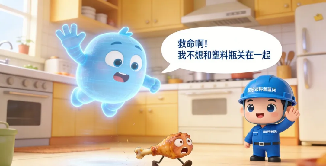 鸡骨头(发出细小的声音):“救命啊!我不想和塑料瓶关在一起,我会被污染的!”