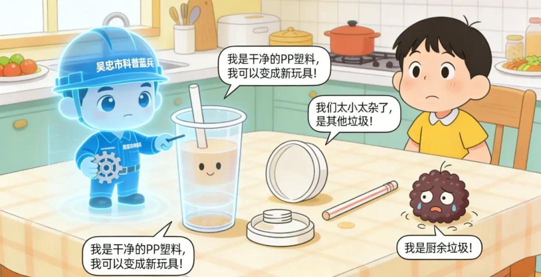 奶茶杯身(委屈地):“我是干净的PP塑料,我可以变成新玩具!”
