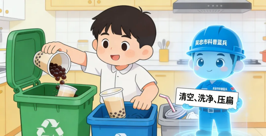 小蓝:“完全正确!可回收物(蓝桶)必须是‘干净、干燥、无异味’的。纸、塑、金、布、玻是五大金刚。所以,喝剩的奶茶要倒掉(厨余),杯子放入可回收,而那些被污染的吸管和复杂的杯盖,只能遗憾地去‘其他垃圾’(灰桶)了。记住,‘清空、洗净、压扁’是可回收物的六字真言!”