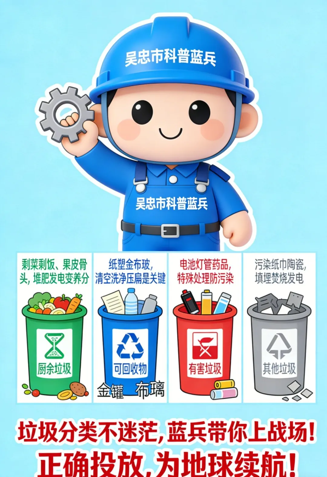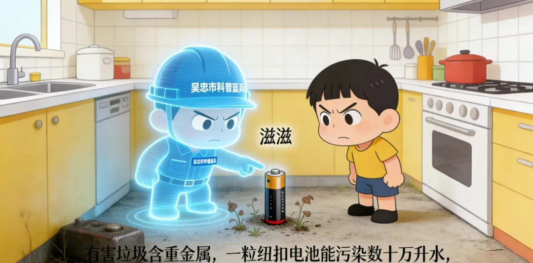 小蓝:“看到了吗?这就是有害垃圾(红桶)的威力!废电池、废灯管、过期药品、杀虫剂……它们含有重金属等有毒物质,一粒纽扣电池就能污染数十万升水!它们必须被特殊处理,放进红色的‘隔离病房’,绝不能和其他垃圾混在一起,否则会造成严重的土地和水源污染!”