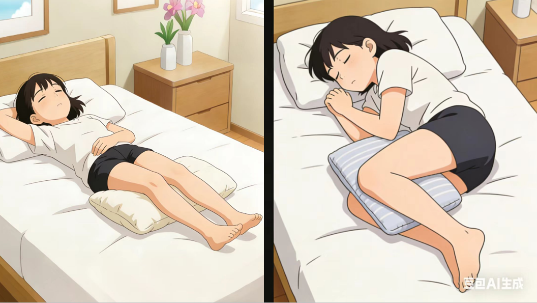 3. 最佳睡姿:仰卧时膝盖下垫个小枕头;侧卧时两腿间夹个薄枕。
