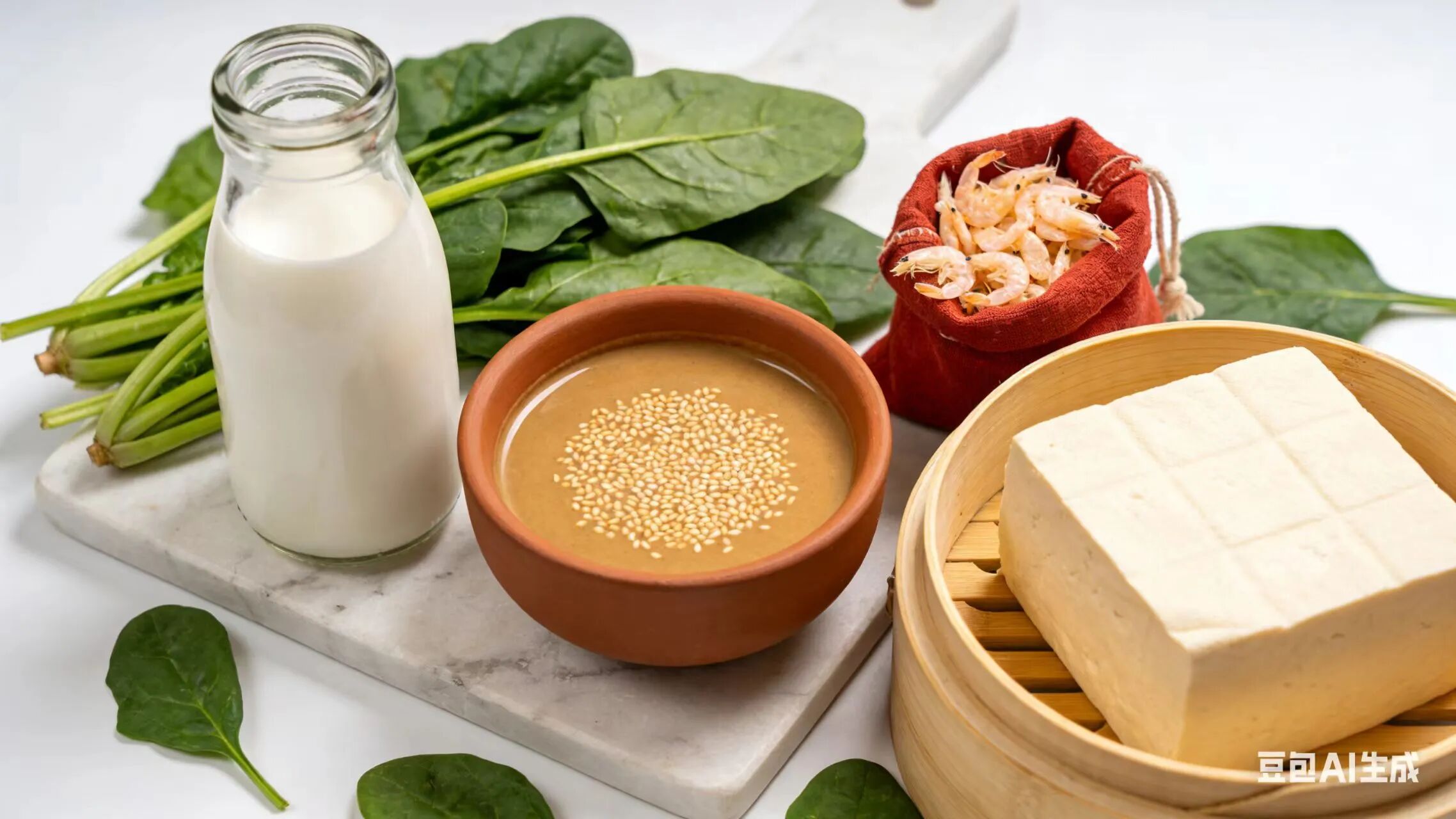 小虾米可以连壳一起吃,豆腐、绿叶蔬菜都是好选择。