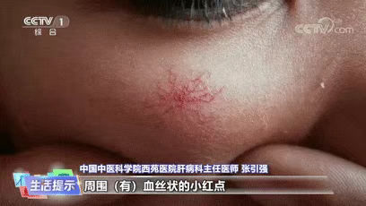 蜘蛛痣是一种细小的血管扩张的表现,看起来像红色或紫色的蜘蛛网状图案,常见于面、颈和上胸部。这可能是肝脏疾病导致雌激素水平升高的结果。