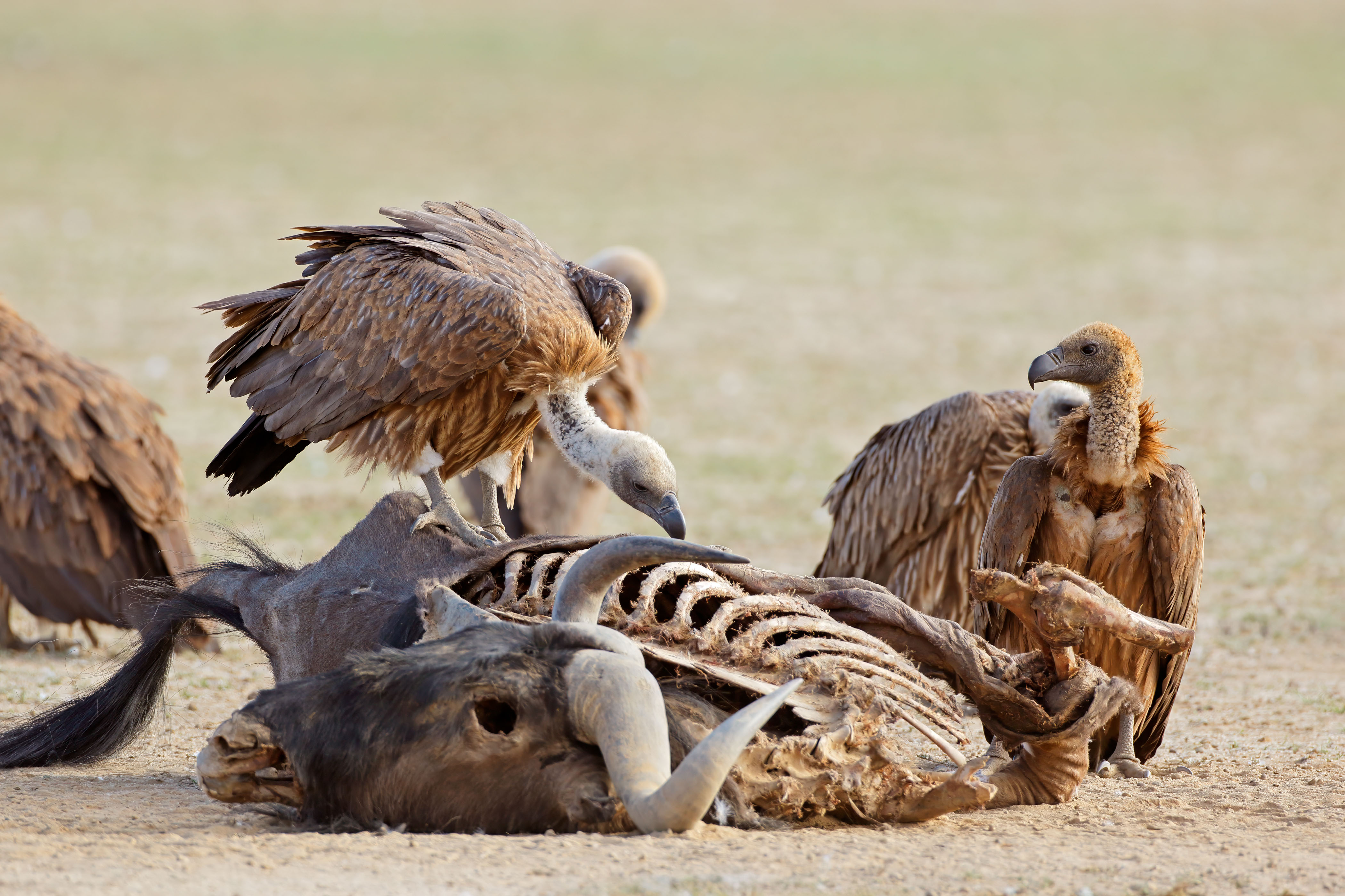 它们甚至能辨别“真火”与“假火”。一群狼在追逐羚羊,秃鹫会评估追猎的成功率与持续时间。如果追猎漫长而猎物依然强壮,它们可能只是“路过观察”;但若猎物明显跛足、狼群合围已成,秃鹫群便会开始降低高度,进入“预备降落”状态。它们等待的,正是狼群完成猎杀、进食到一定程度后离开的那一刻。此时,战场上留下了大量富含营养的残骸、骨髓与内脏,而主要的捕食者已经饱腹且失去攻击欲望。秃鹫群这才如一片灰云般降下,开始它们几乎无风险的盛宴。