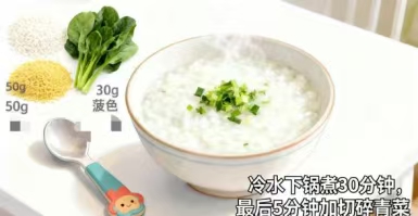 儿童流感发热时,适合食用清淡易消化的白粥,搭配少许青菜碎。 双米青菜粥(儿童发热期适用)