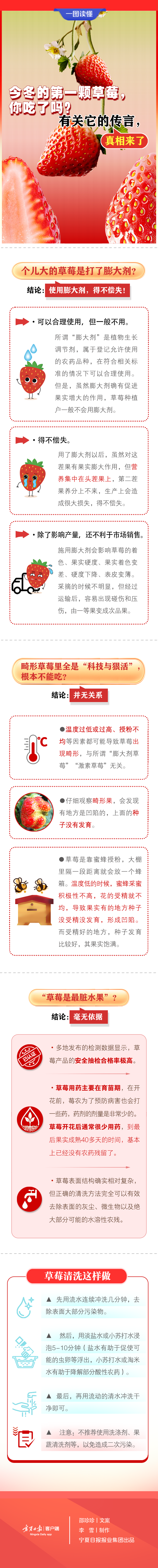 图文简介: 近期,草莓开始大量上市,不少人已经吃到了“冬天的第一颗草莓”,但是网上有些传言,却让消费者心里直打鼓。真相到底是啥?带您一图读懂!
